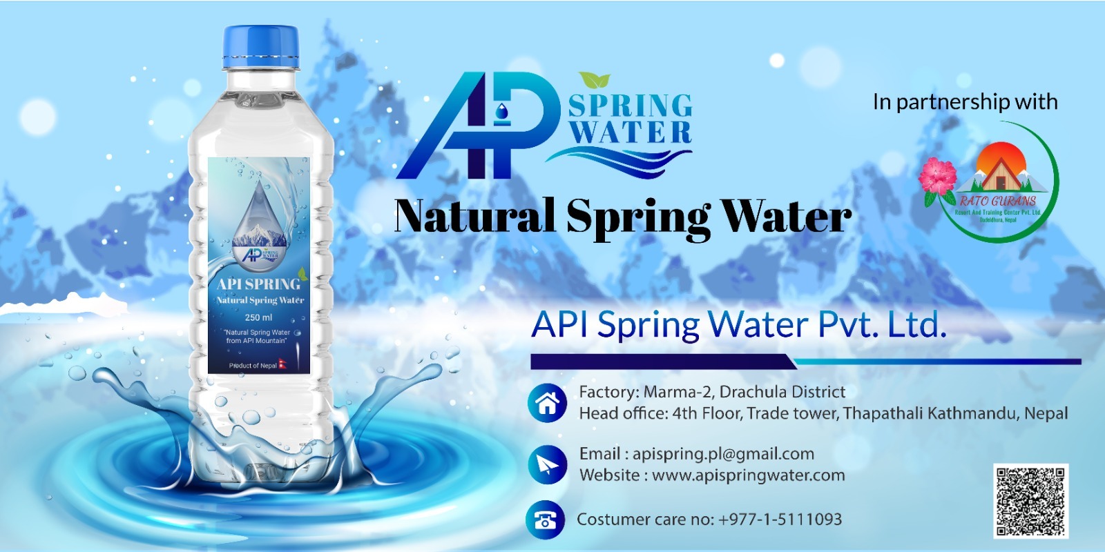 Api Spring Private Limited, located in Darchula, Nepal, operates in a mountainous region known for its natural spring water sources. The location provides access to pristine water supplies, supporting the company’s mission of offering pure, high-quality spring water. Accessibility may be more challenging due to the remote terrain, but the company likely has infrastructure in place to manage water extraction and distribution efficiently, serving both local and broader markets within Nepal and potentially for export